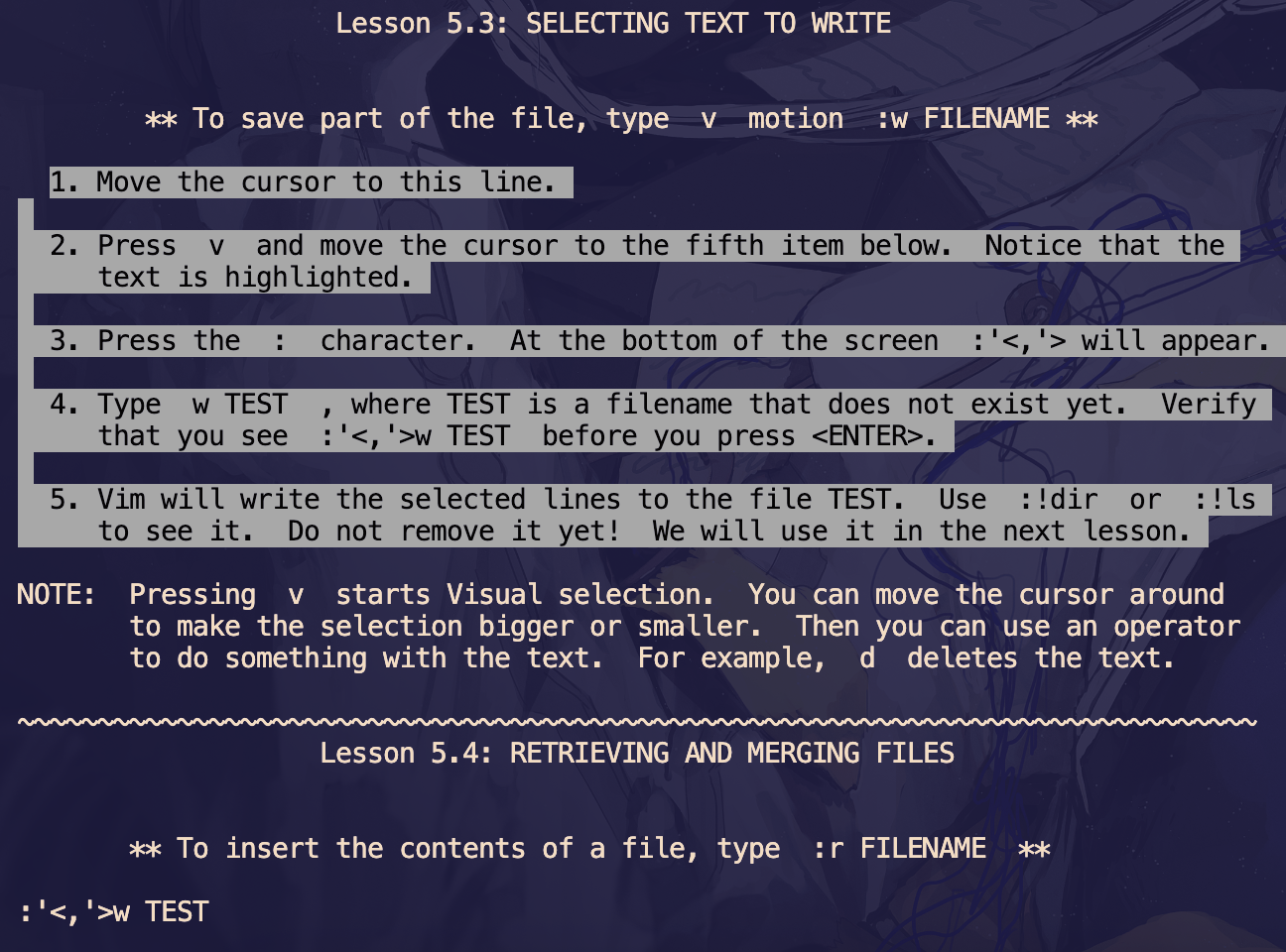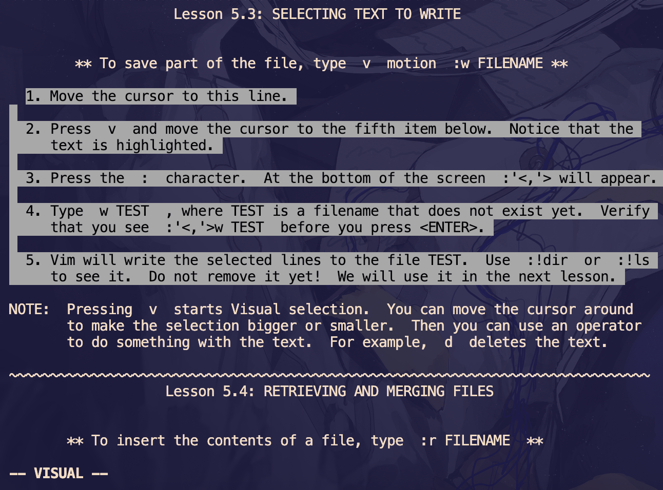 使用 v 命令启动可视化模式,移动光标高亮选中的内容(此时输入 d 会删除选区内容)