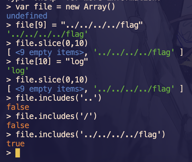 然后 /checkfile 这里是一个文件读取,ban 了目录穿越,但是注意到 file = file.slice(0, 10),可以利用 includes 对数组与字符串的匹配差异进行绕过