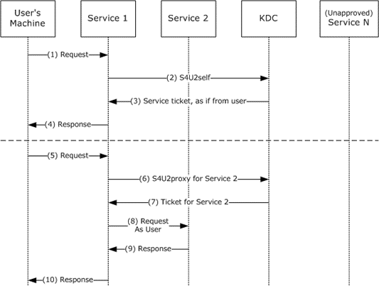 具体过程是收到用户的请求之后,首先代表用户获得针对服务自身的可转发的 Kerberos 服务票据(S4U2SELF),拿着这个票据向 KDC 请求访问特定服务的可转发的 TGS(S4U2PROXY),并且代表用户访问特定服务,而且只能访问该特定服务。