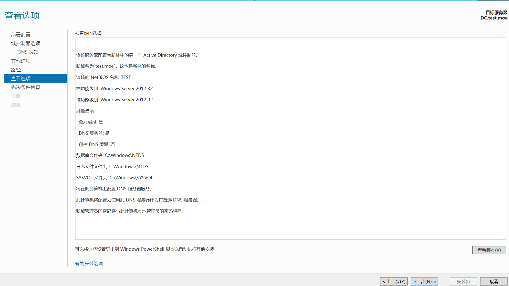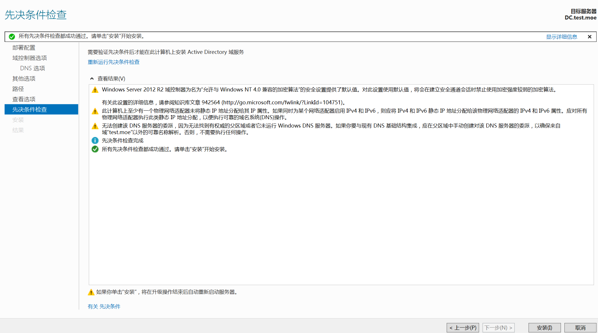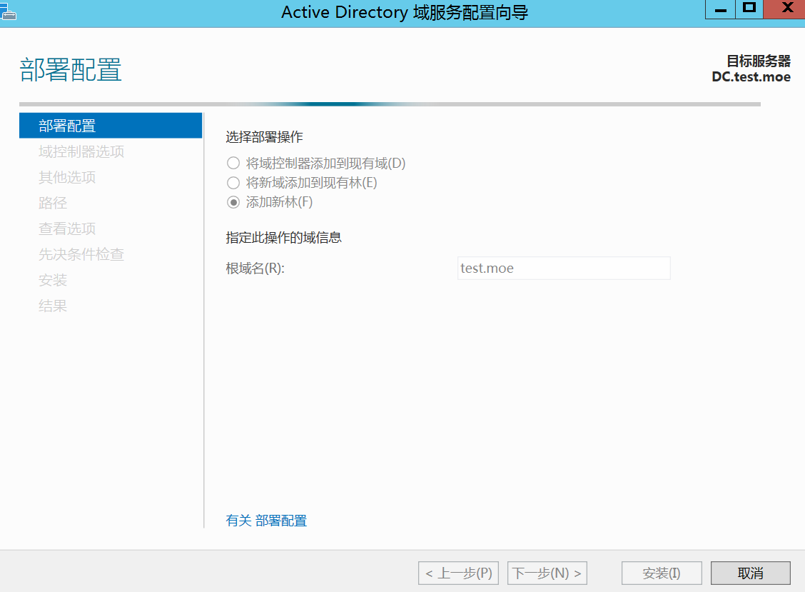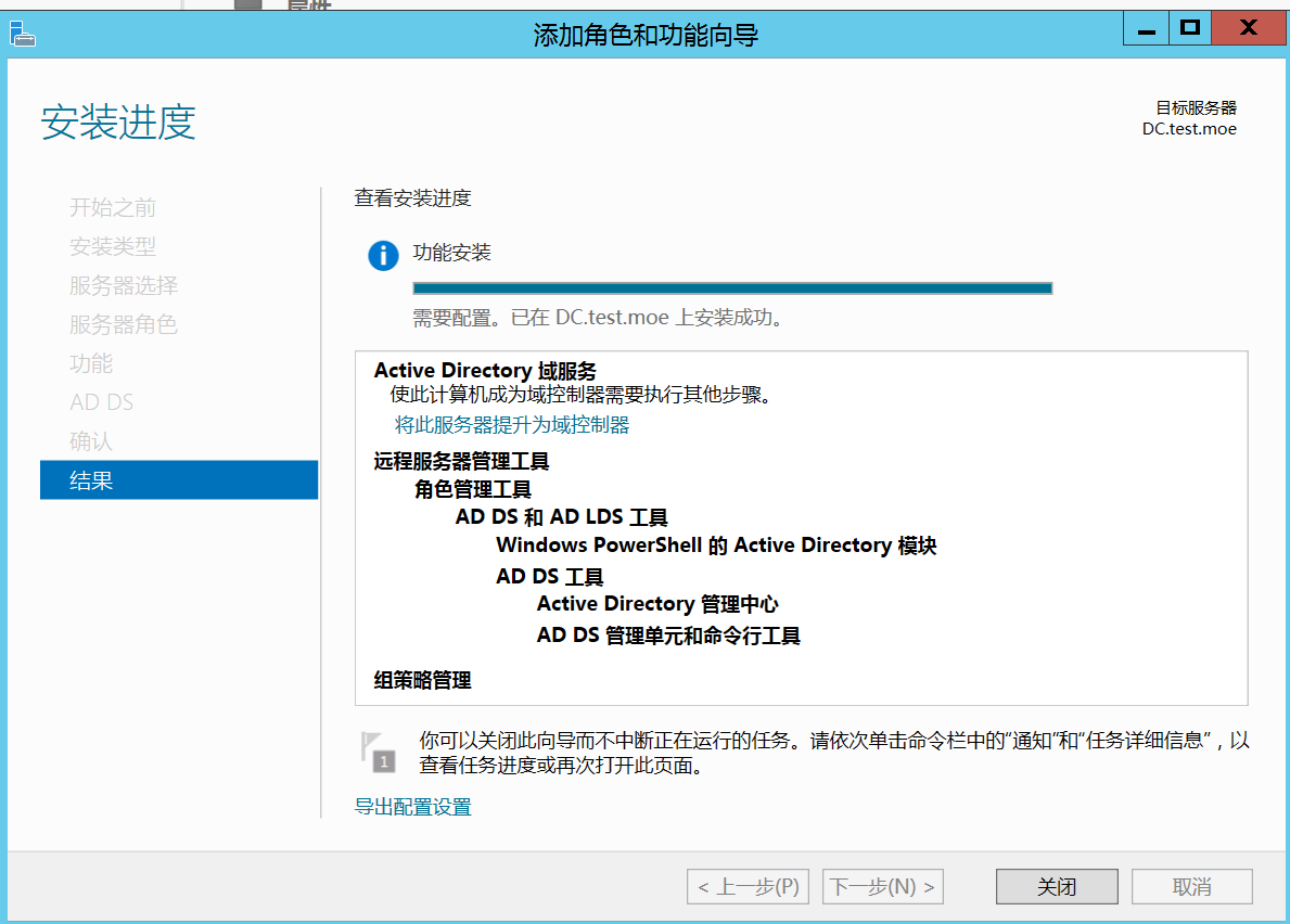 安装完成时会出现“将此服务器提升为域控制器”,点击,进入 Active Directory 域服务配置向导