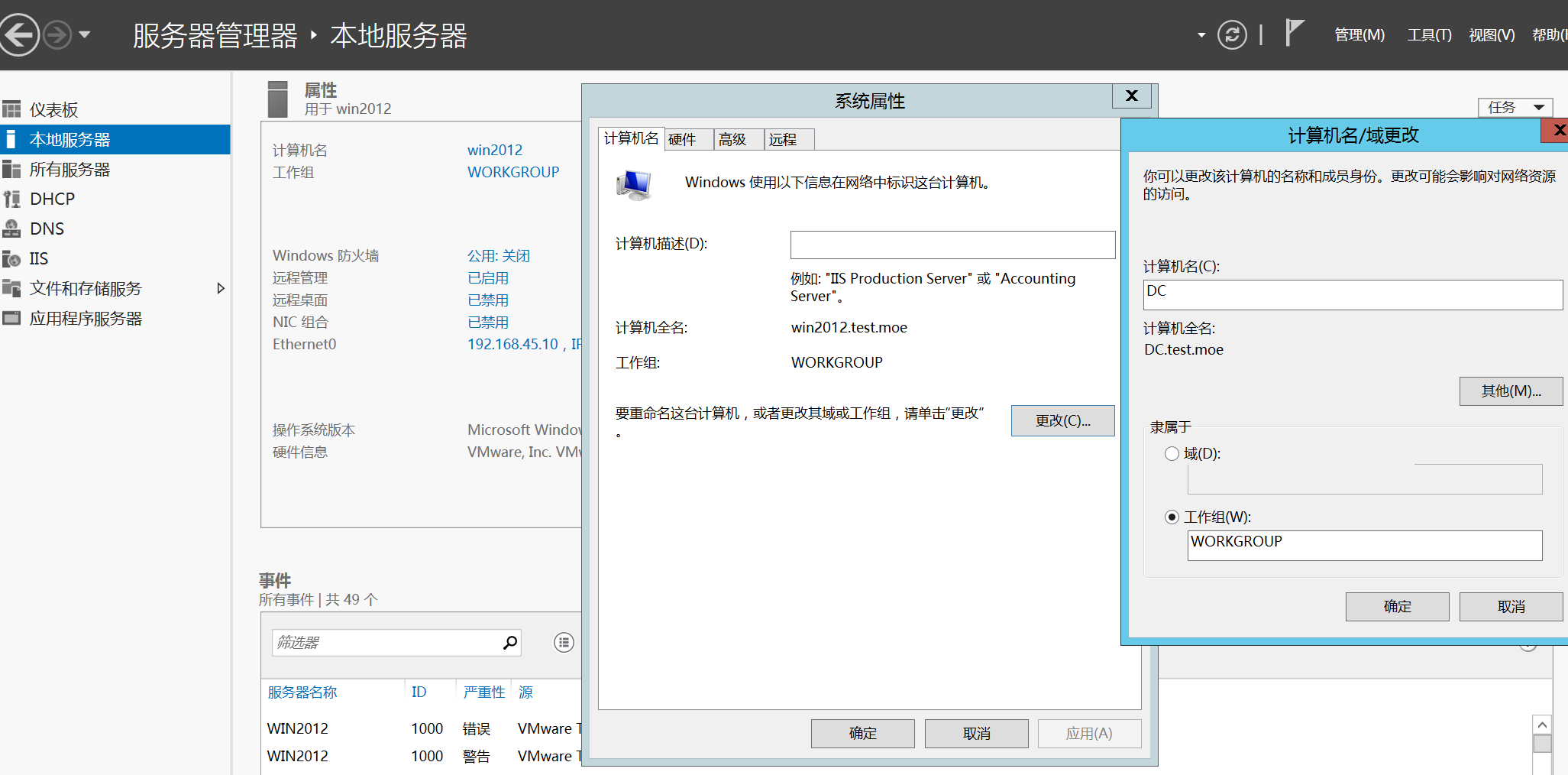 在服务器管理器中修改主机名为 DC,并重新启动服务器