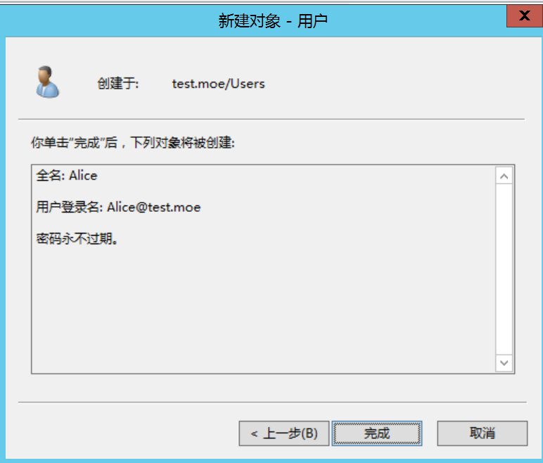 选中 Users 目录右键,新建-用户,设置新用户 Alice,密码永不过期,密码设置为 c 4%@aEWo