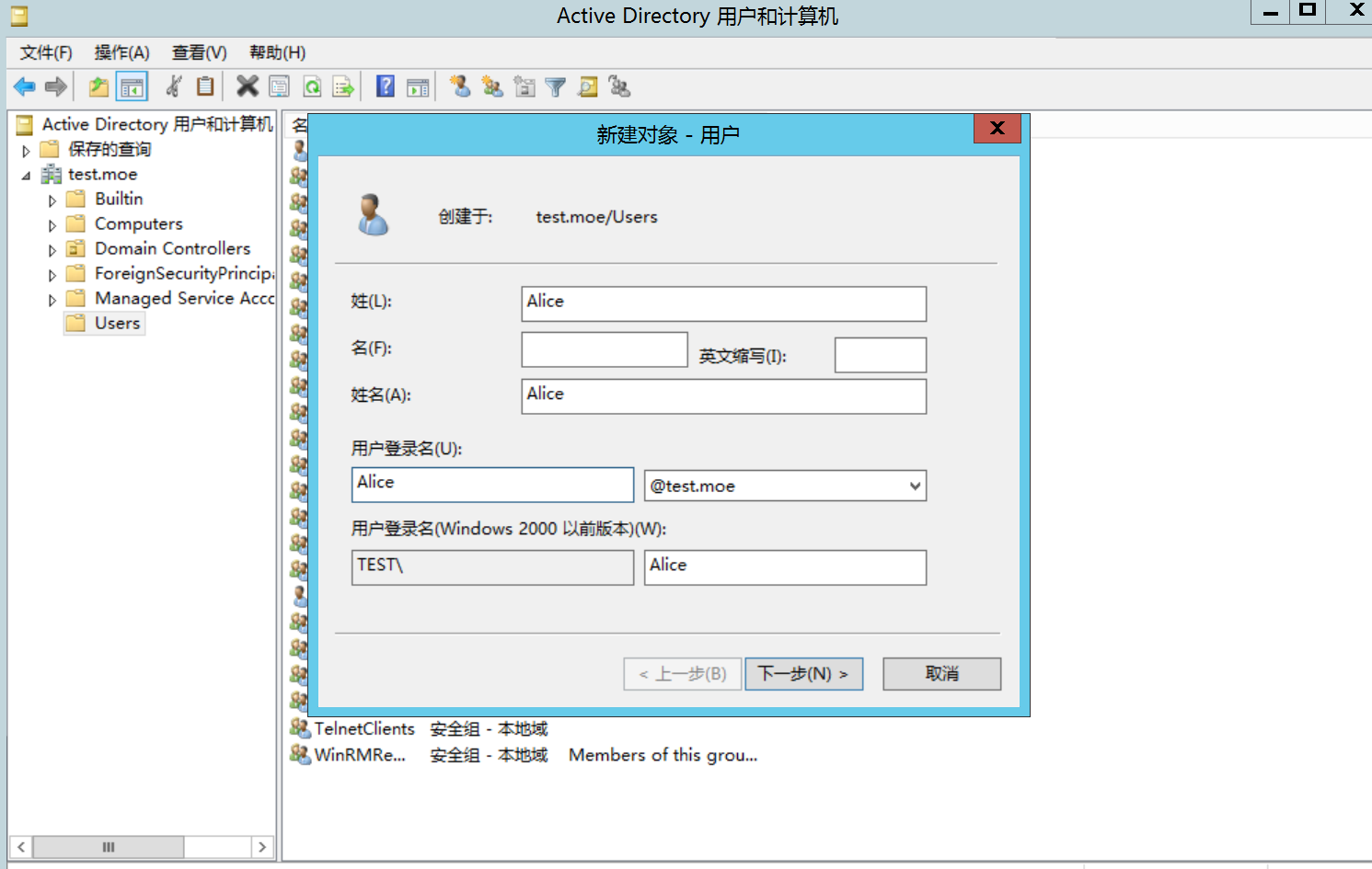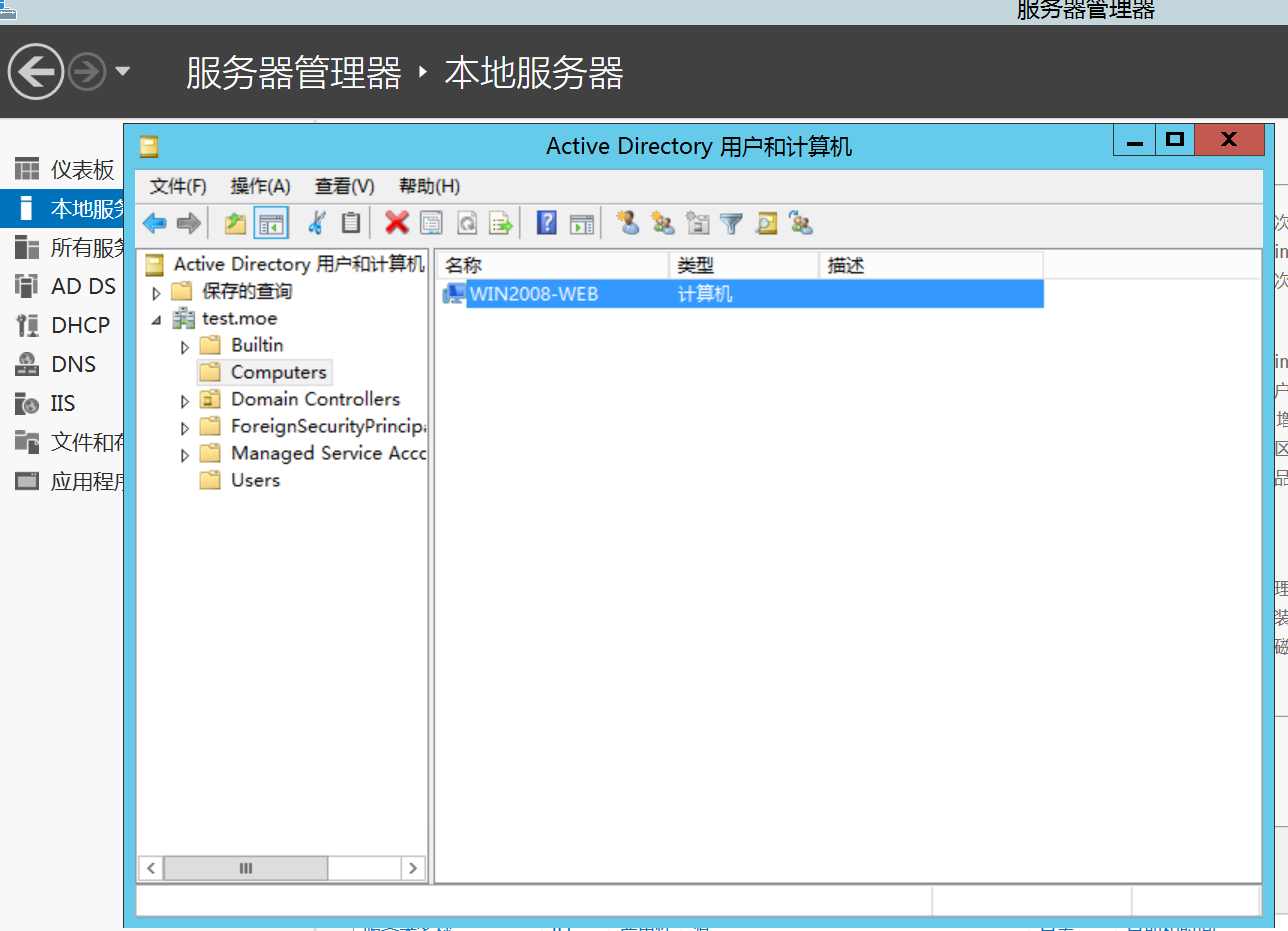 如上图 DC=test, DC=moe 就是 test.moe 域的域分区,包含以下内容: