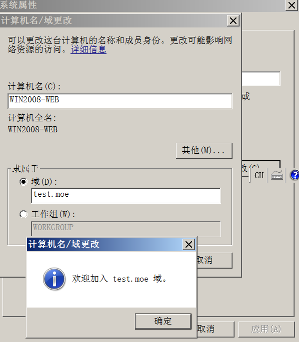 修改主机名为 WIN 2008-WEB,隶属于域,域名修改为 test.moe