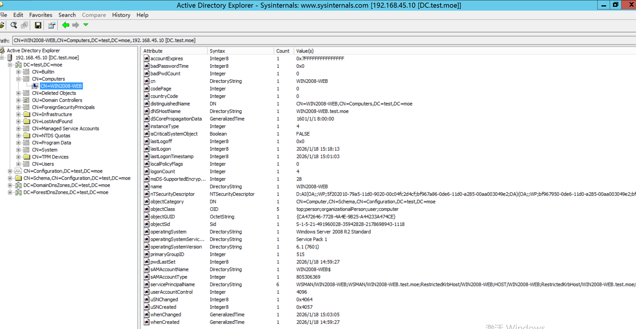 含义是 DC 1 对象在 test.moe 域的 Domain Controllers 组织单元中