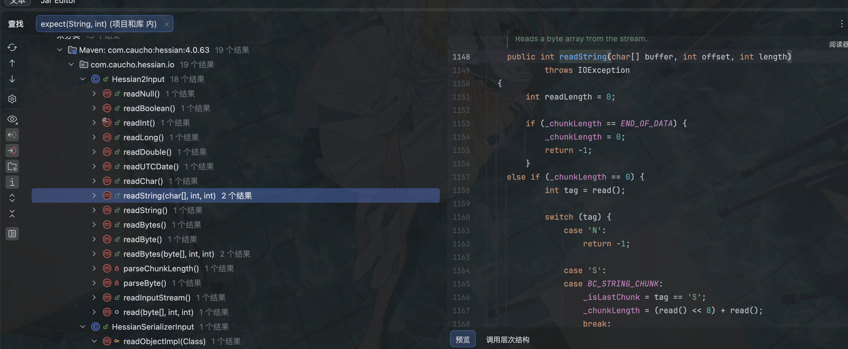 readString,调用一次read(),_offset+1,由于 hashMap 不属于readString判断的任何基本类型,所以走到 default 的expect(),于是_offset-1 - 接下来获取上下文,此时这个偏移开始的字节流对应的是 hashMap 的序列化数据,然后进行一次