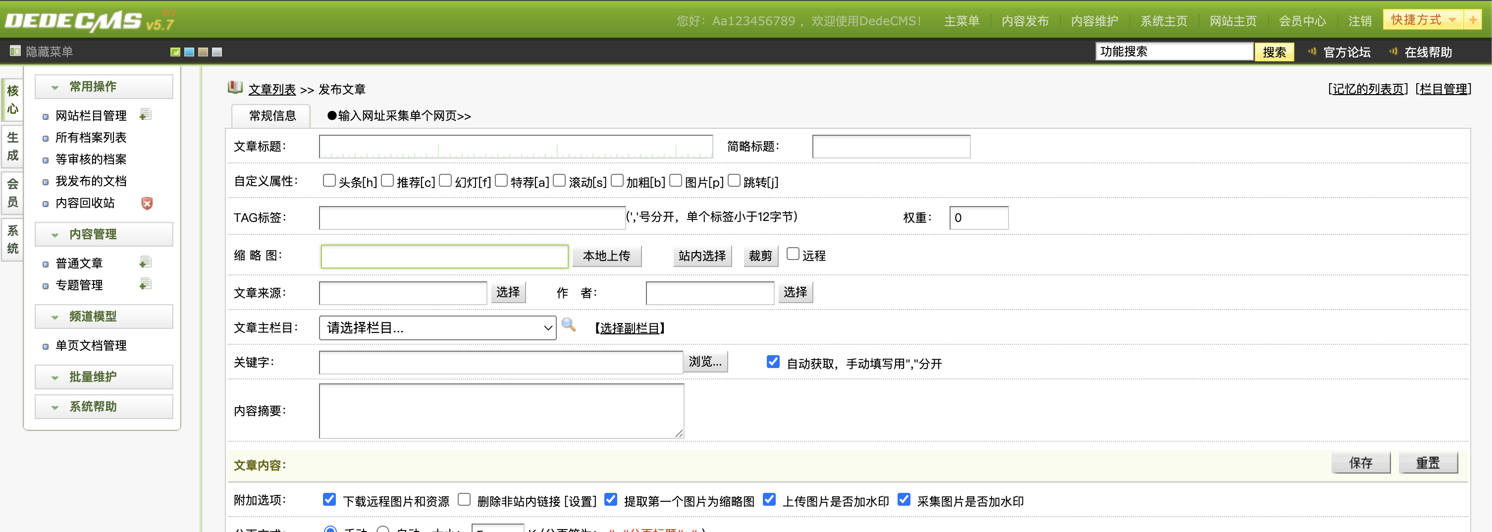 进入后台,核心-普通文章-添加文档-缩略图处可以上传文件,直接传个图片马改 php 后缀上去